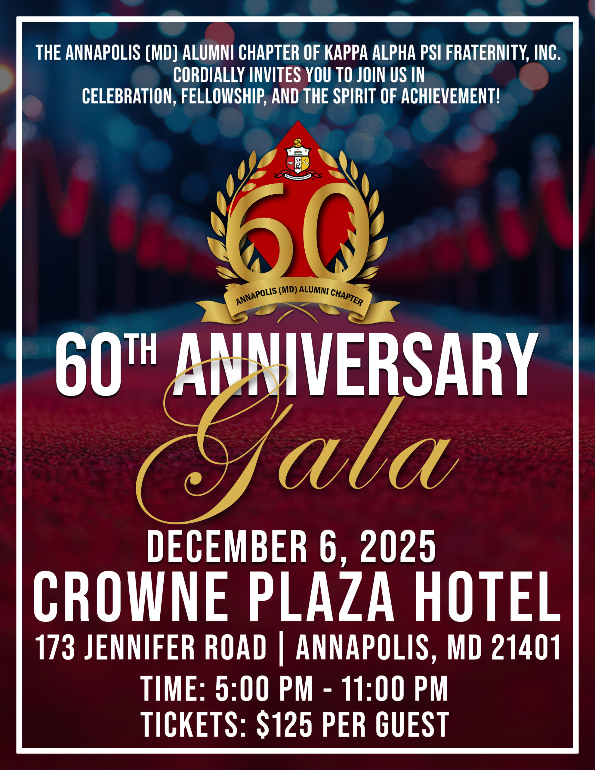 The Annapolis (MD) Alumni Chapter cordially invites you to join us in celebration, fellowship, and the spirit of achievement as we observe our 60th Charter Day Anniversary. Our Keynote Speaker will be Brother Charles E. Exum Jr., Chief Administrative Officer of the Grand Chapter and 29th Eastern Province Polemarch.